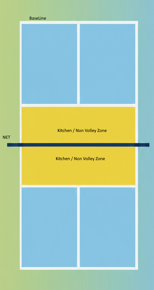 - A non-volley zone (the “kitchen”) extending 7 feet from the net; yellow area.